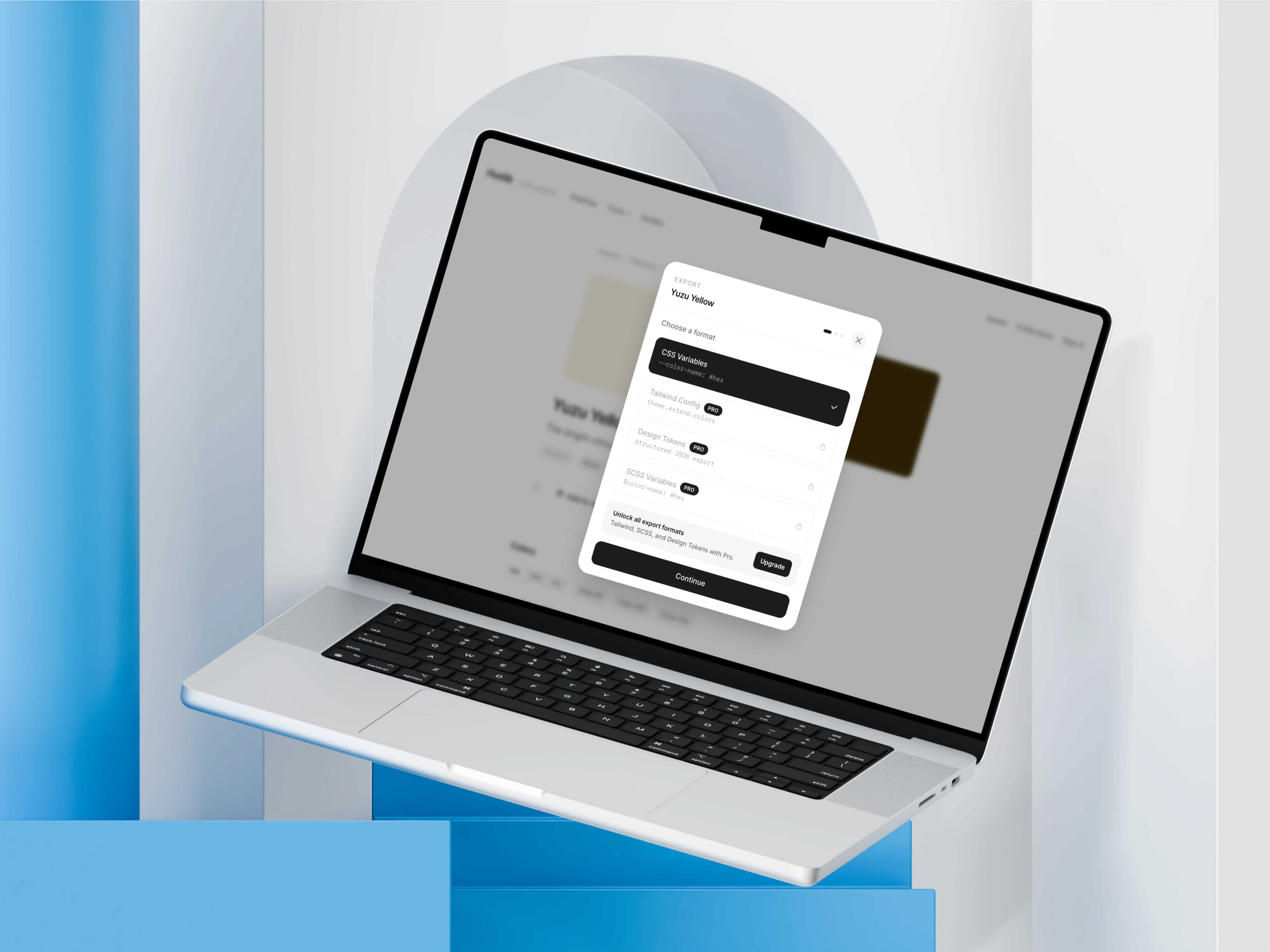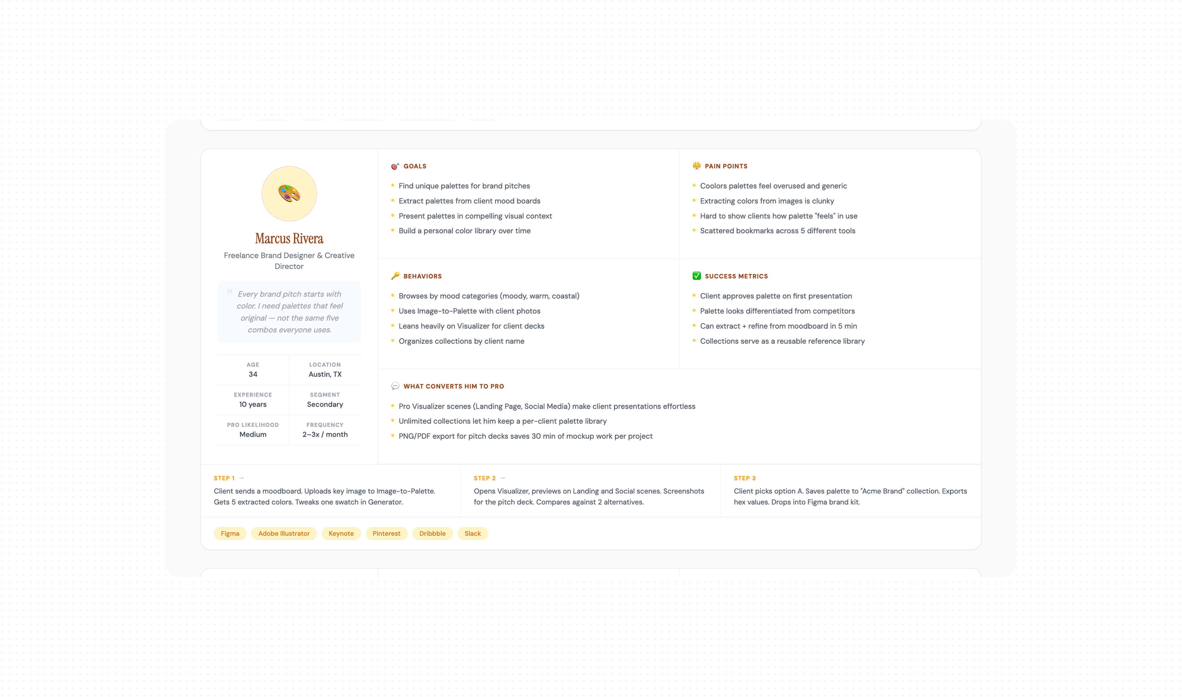 Free users get the full tool ecosystem, three visualizer scenes, and basic exports (CSS, hex). Pro unlocks three additional premium visualizer scenes, PNG/PDF export of visualizations, advanced export formats (Tailwind config, SCSS, JSON tokens), and unlimited collections. The Pro gates are surfaced naturally within workflow so users encounter upgrade prompts when they try to access a Pro scene or export, not through interruptive modals. Billing is handled through Stripe with webhook-based subscription management.