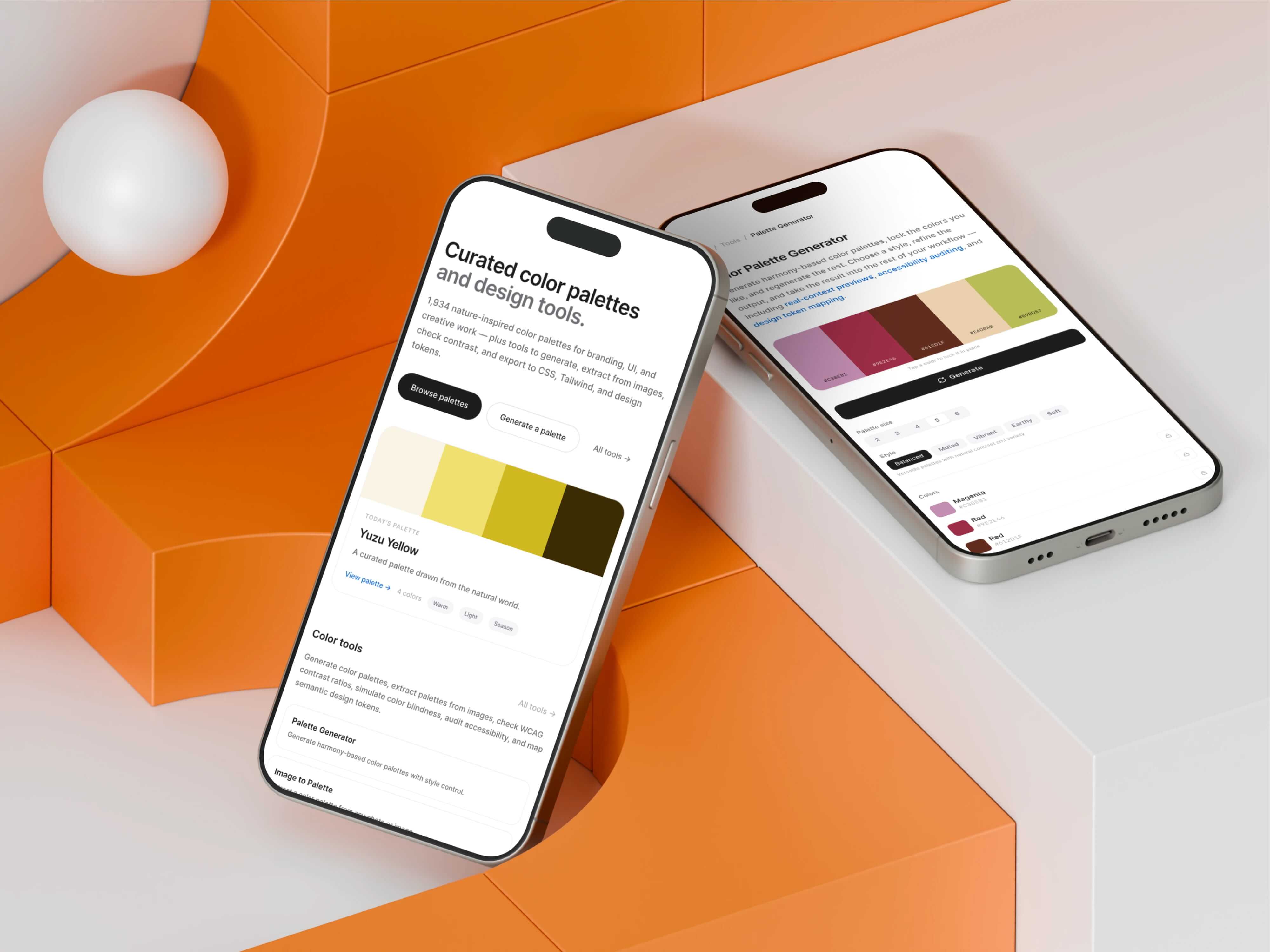Huelib combines curated nature-inspired palettes with a connected tool ecosystem. From palette generation, image extraction, real-context visualization, accessibility auditing, color blindness simulation, semantic token mapping, to developer-ready exports. The platform includes a freemium Pro tier with Stripe billing, a guides section for long-tail SEO content, and a complete internal linking architecture optimized for organic growth.