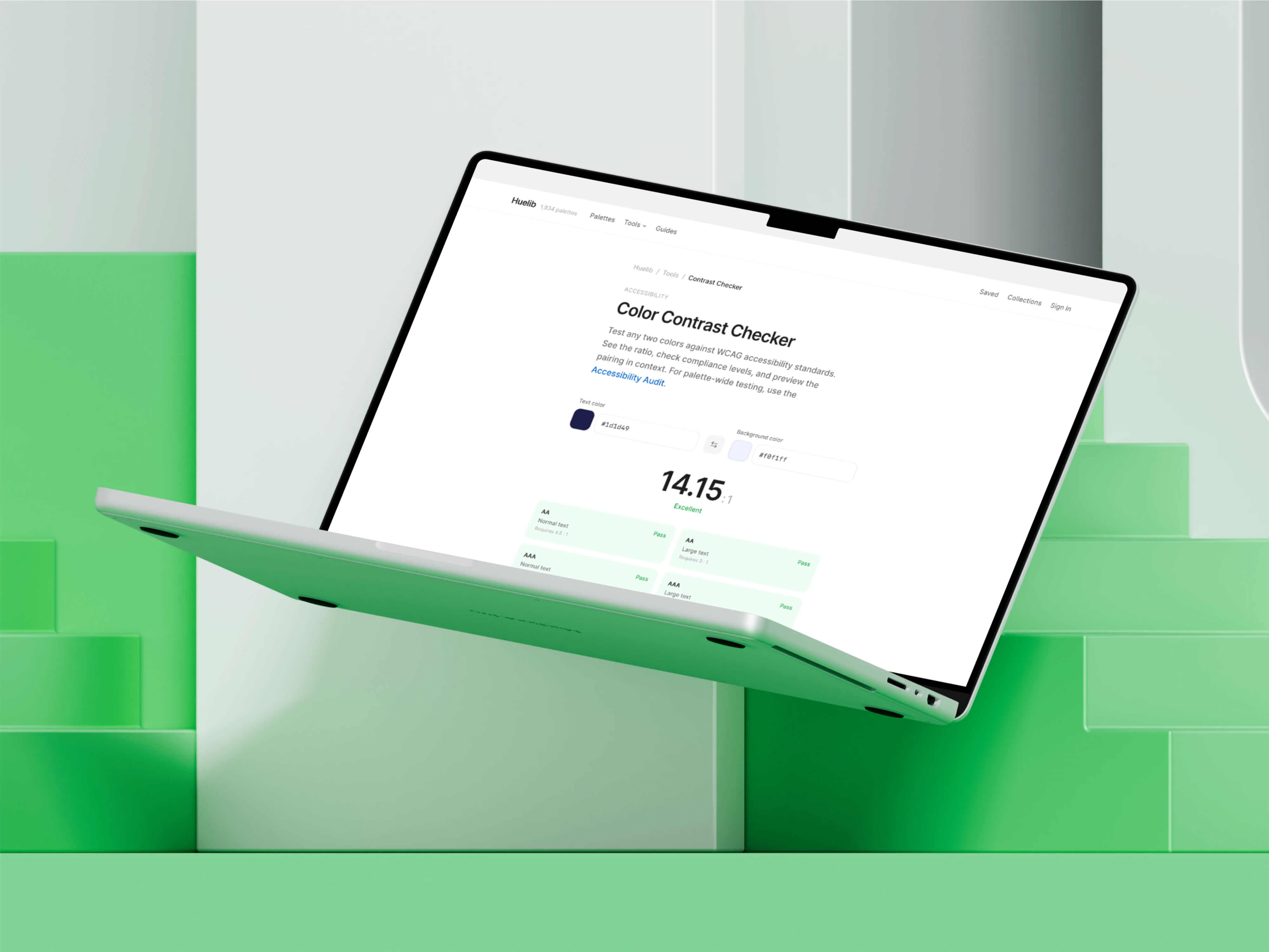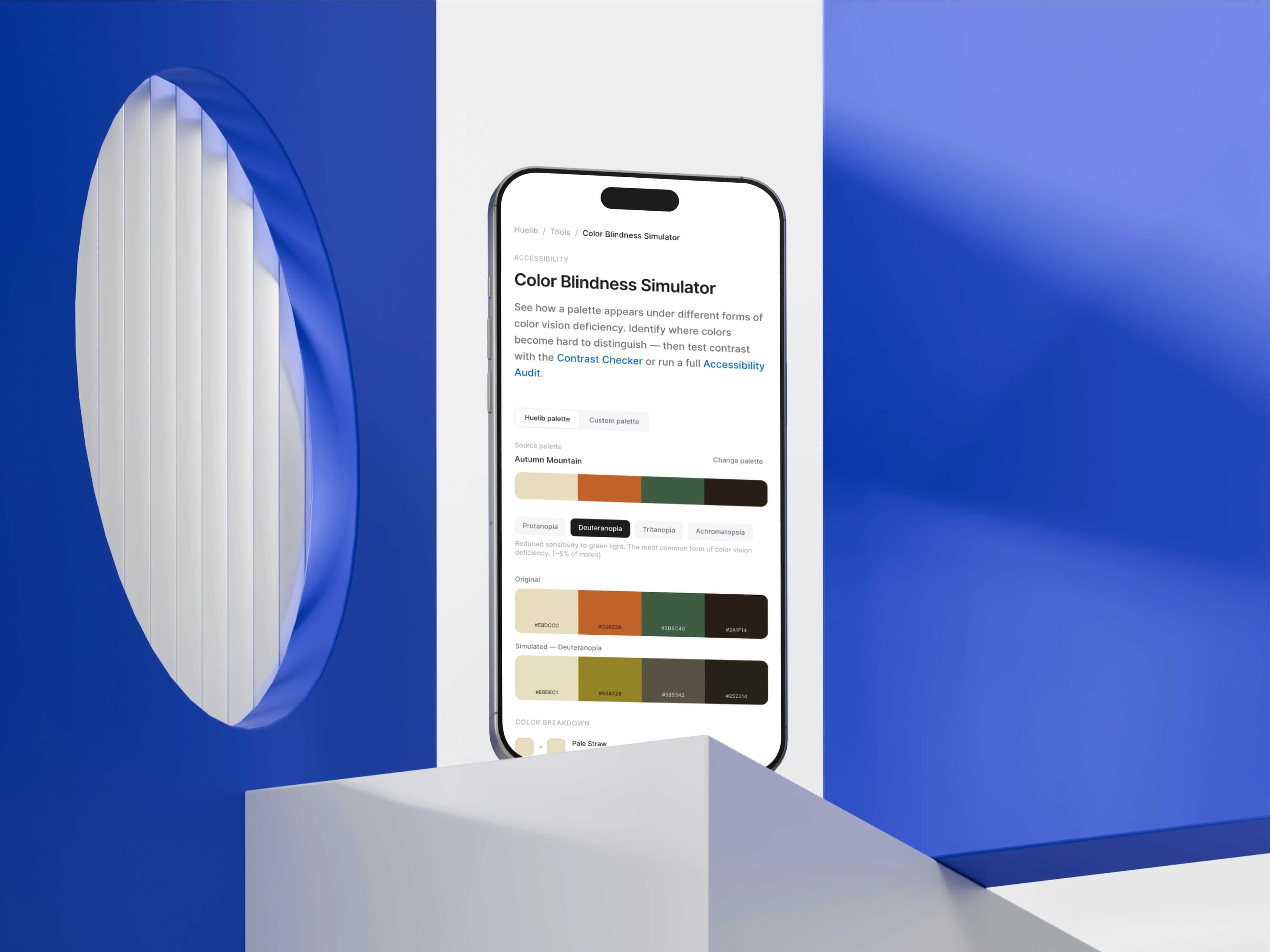 A Contrast Checker for quick WCAG validation, a Palette Accessibility Audit that evaluates every color combination across an entire palette, and a Color Blindness Simulator that shows how palettes appear under protanopia, deuteranopia, tritanopia, and achromatopsia.
