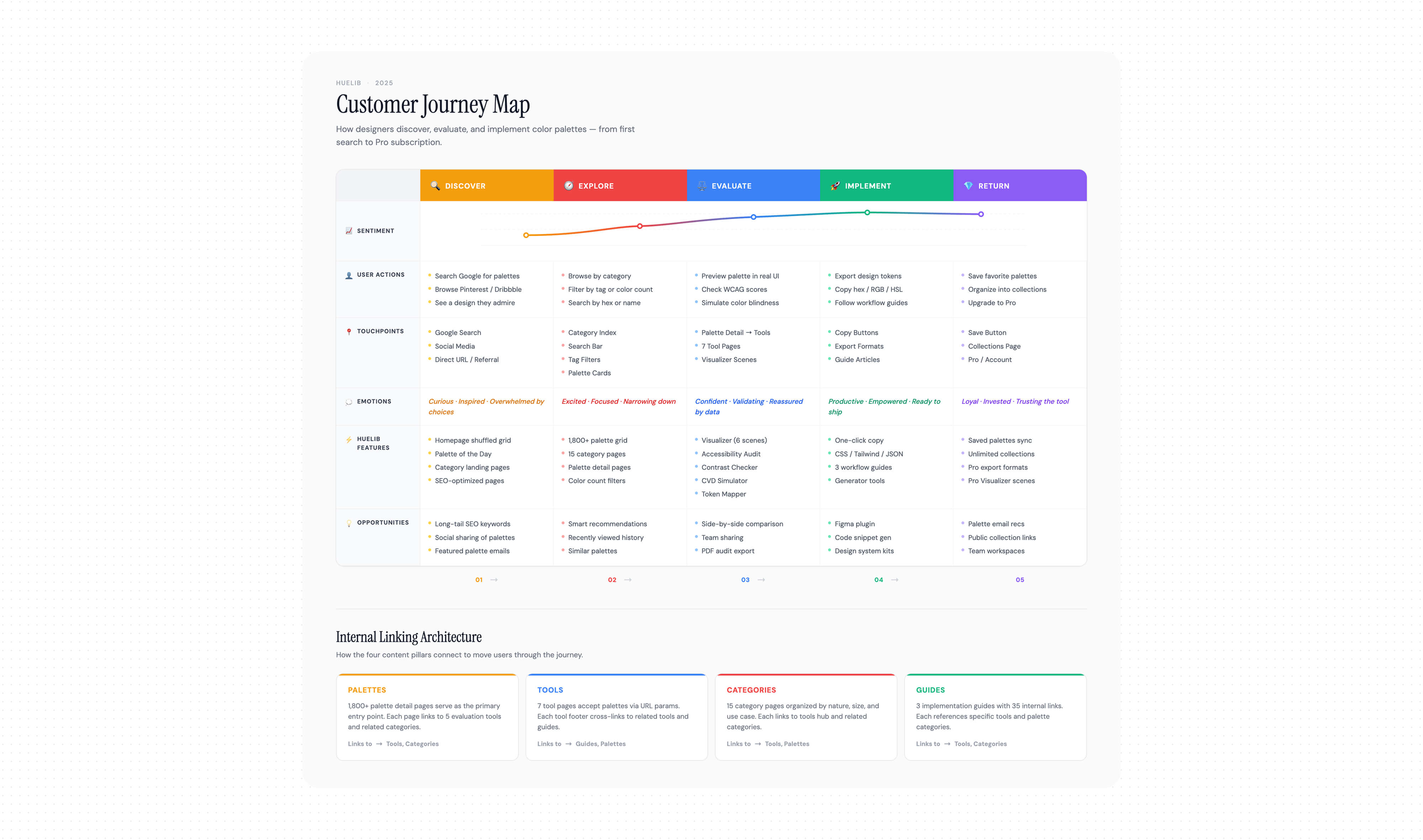 I structured the site around three interconnected pillars: discovery (palettes, categories, generator, image-to-palette), evaluation (visualizer, contrast checker, accessibility audit, color blindness simulator), and implementation (semantic token mapper, multi-format exports). Every page links meaningfully to related pages across all three pillars, creating a dense internal linking mesh that supports both user navigation and search engine crawlability. The IA includes 1,800+ palette detail pages, 25+ category landing pages, 7 tool pages, and 3 guide articles each with unique metadata, breadcrumbs, and contextual related-content modules.